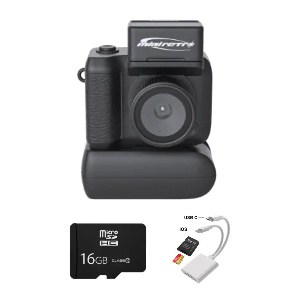 📍 Tu cámara Mini Retro, cable de carga USB-C, guía de inicio rápido y cordón. Añade un paquete de tarjetas SD para empezar a crear de inmediato y ahorra 20 €.